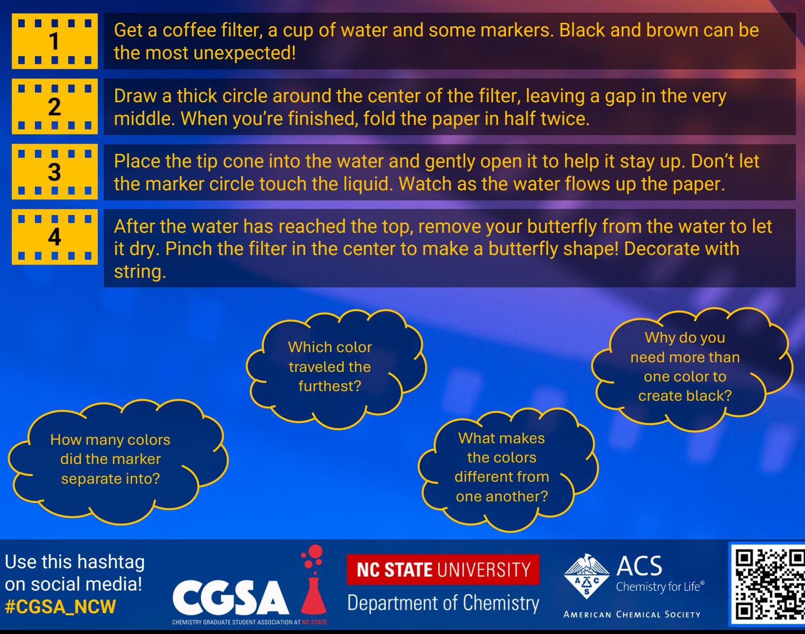 Let’s make some beautiful butterflies! Chromatography is the process of separating a mixture of components into their parts. This is best illustrated by markers, which use a combination of many pigments to create smooth colors. Dipping a filter marked with the ink in water will spread the colors into wondrous patterns. Chromatography is used in many labs to find out what mystery substances are. Use this technique to make some unique patterns in your butterfly wings!