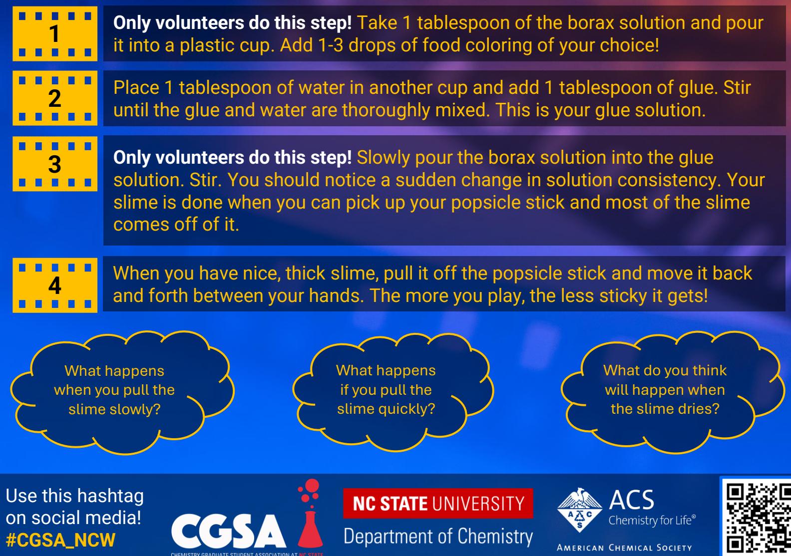Borax is harmful if ingested. Hands should be washed after playing with slime. Volunteers and children should wear safety glasses to prevent borax dust in the eyes. Food coloring can stain clothing. Lab coats are optional!