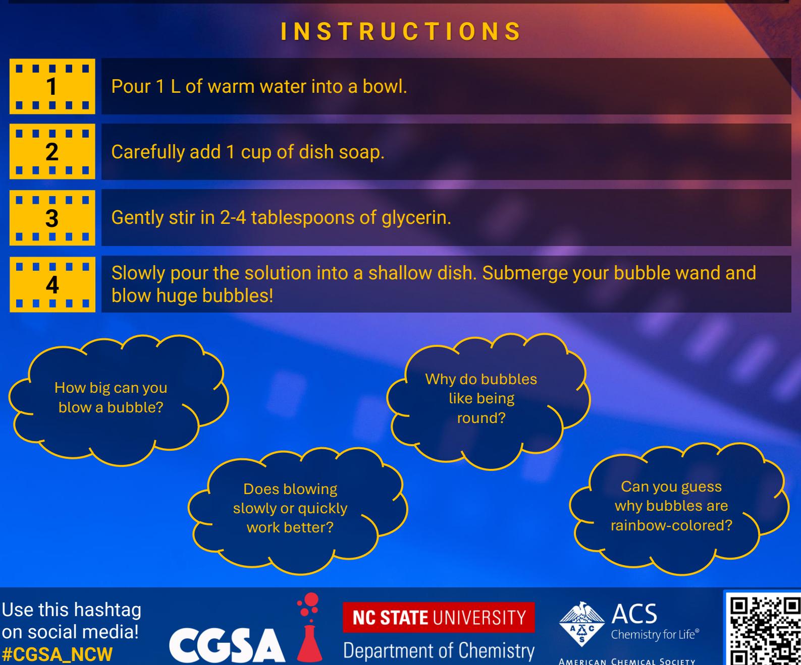 What makes a bubble? You may know that soap is important to form one, but did you know that there is also a tiny layer of water that is vital to keeping the bubble unpopped? The bubble “pops” when that layer of water is broken. When you add glycerin to the bubble mixture, it holds onto the water and keeps it together. This added force allows the skin of the bubble to stretch even further than normal. The glycerin helps with the surface tension of your bubbles, making them “thicker” and giving them more structure so they last longer!