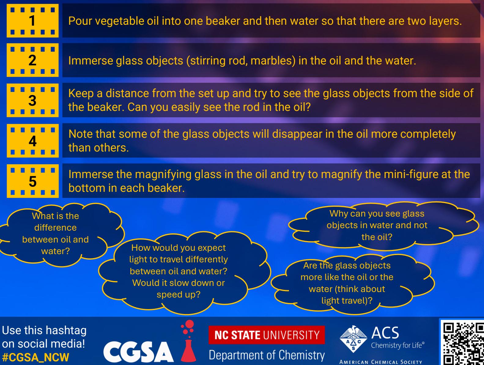 You can make glass objects disappear completely! You see glass in air because it bends light as it passes through it. This is because when light passes from air into the glass, it actually changes speed. It’s this change in speed that causes the light to reflect and refract, allowing you to see the glass object! However, when you place the glass in something that isn’t air – something that light travels through at a similar speed – it doesn’t bend the light anymore – so you can’t see it anymore!